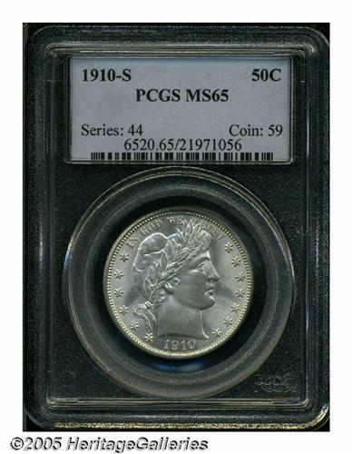 <B>1910-S<50C> MS65 PCGS.</B></I> Fully frosty and highly lustrous with brilliant silver surfaces. This exquisite Gem has exceptional aesthetic appeal, and it will certainly prove to be a joy to the connoisseur. It is also an elusive date in Gem quality, with only 22 equivalent or finer coins certified by PCGS. Population: 8 in 65, 14 finer (5/05).