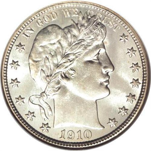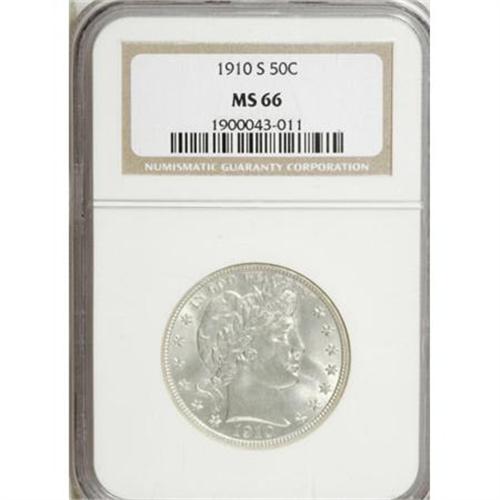<B>1910-S 50C MS66 NGC.</B></I> In his <I>Complete Guide to Barber Halves,</B></I> David Lawrence indicates that the 1910-S is common in lower grades, but quite tough in AU55 and above. The population statistics confirm that: NGC and PCGS combined have certified barely 100 examples in all Mint State grades. This example at first glance appears untoned, but closer inspection reveals a barely discernible veil of faint tan and powder-blue. Lustrous surfaces exhibit nicely executed design features, save for a couple of the obverse star centers and the eagle's right (facing) claw and adjacent arrow feathers. A few minor marks on the cheek are grade-consistent. Census: 7 in 66, 2 finer (1/08).<BR><I>From The Southwest Collection.</B></I><BR><BR><B>Coin Engraver:</B> Charles E. Barber<BR><BR><b>Shipping:</b> Coins & Currency (<a target="_blank" href="http://www.heritageauctions.com/common/shipping.php">view shipping information</a>)