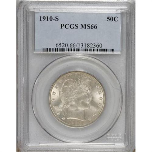 <B>1910-S 50C MS66 PCGS.</B></I> Highly lustrous and fully struck with remarkably clean surfaces that appear to be essentially untoned, despite a faint degree of speckled patina on the obverse. This issue had a fairly high mintage of nearly two million pieces, but only a tiny fraction of that number survive at the Premium Gem level of preservation. Population: 11 in 66, 4 finer (6/07). <BR><BR><b>Shipping:</b> Coins & Currency (<a target="_blank" href="http://www.heritageauctions.com/common/shipping.php">view shipping information</a>)