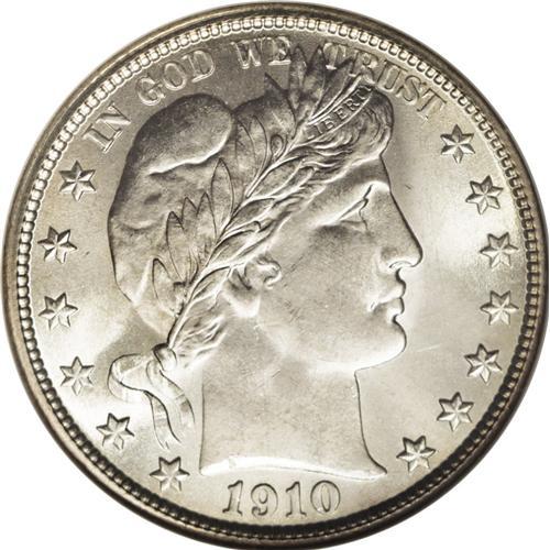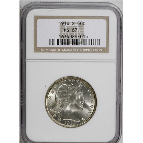 <B>1910-S<50C> MS67 NGC.</B></I> Well struck and highly lustrous, with a rich frosty sheen over both sides and essentially untoned silver-white surfaces. Faint roller marks are noted on Liberty's cheek, and a couple of tiny nicks are evident on the jaw and upper neck, but these are nearly invisible without the aid of magnification. Although close to 2 million 1910-S half dollars were produced, those coins were required in commerce and surprisingly few were set aside by contemporary collectors. As a result, fewer than 100 Mint State survivors are known, and this marvelous Superb Gem must be counted among the finest of those. NGC and PCGS together have certified just four coins at MS67, with two more at MS68 (6/06).<BR><I>From The Belle Glade Collection.</B></I> <BR><BR><B>Important