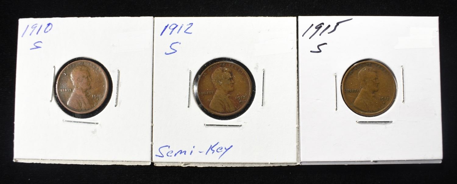 1910-S VF & 1912-S, 1915-S F LINCOLN WHEAT CENT