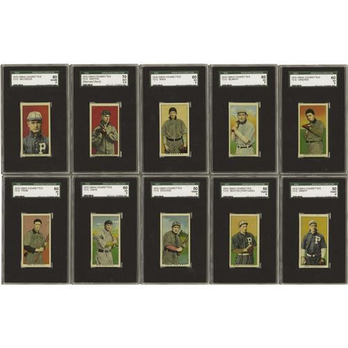 <B>1910 T212 Obak Partial Set (95/175).</B></I> Presented here is a 95 card partial set with 85 featuring the '175 Subjects' verso and 10 with the very scarce '150 subjects' back. This West Coast counterpart of the T206 set is the second of the three annual Obak issues and is complete at 175 subjects from the Pacific Coast League (PCL) and the Northwestern League (NWL). Thirteen cards have been graded by SGC. Includes: Graded cards -SGC 80 EX-NM 6: 1 card. SGC 70 EX+ 5.5: 1 card. SGC 60 EX 5: 5 cards. SGC 50 VG-EX 4: 3 cards. SGC 40 VG 3: 1 card. SGC 30 GOOD 2: 2 cards. The remaining '175 subjects' grades 29% EX to VG-EX, and 71% Fair to VG. The 10 '150 subjects' all grade VG or lesser.<BR><BR><b>Shipping:</b> Sportscard (<a target="_blank" href="http://www.heritageauctions.com/common/shipping.php">view shipping information</a>)
