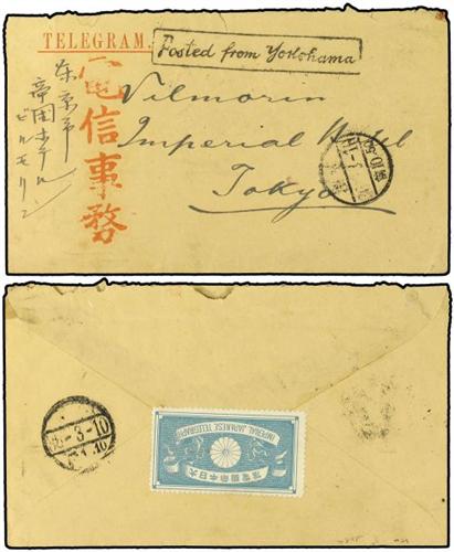 1910 Telegram envelope to the "Imperial Hotel Tokyo" cancelled by boxed POSTED FROM YOKOHAMA cachet with Imperial Japanese Telegraph label on reverse and Yokohama departure with TOKYO arrival on reverse. Very fine item.