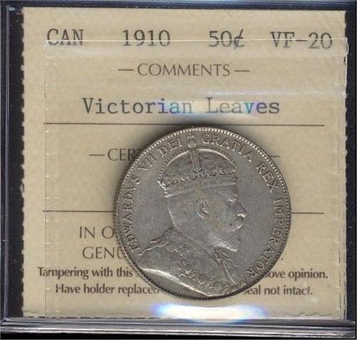 1910 Victorian leaves 50¢ ICCS VF20. A nice problem free example.