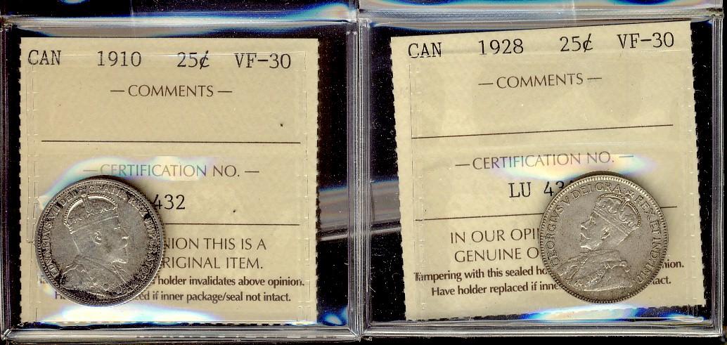 1910 and 1928. Lot of 2 ICCS graded 25¢ coins, both VF30.