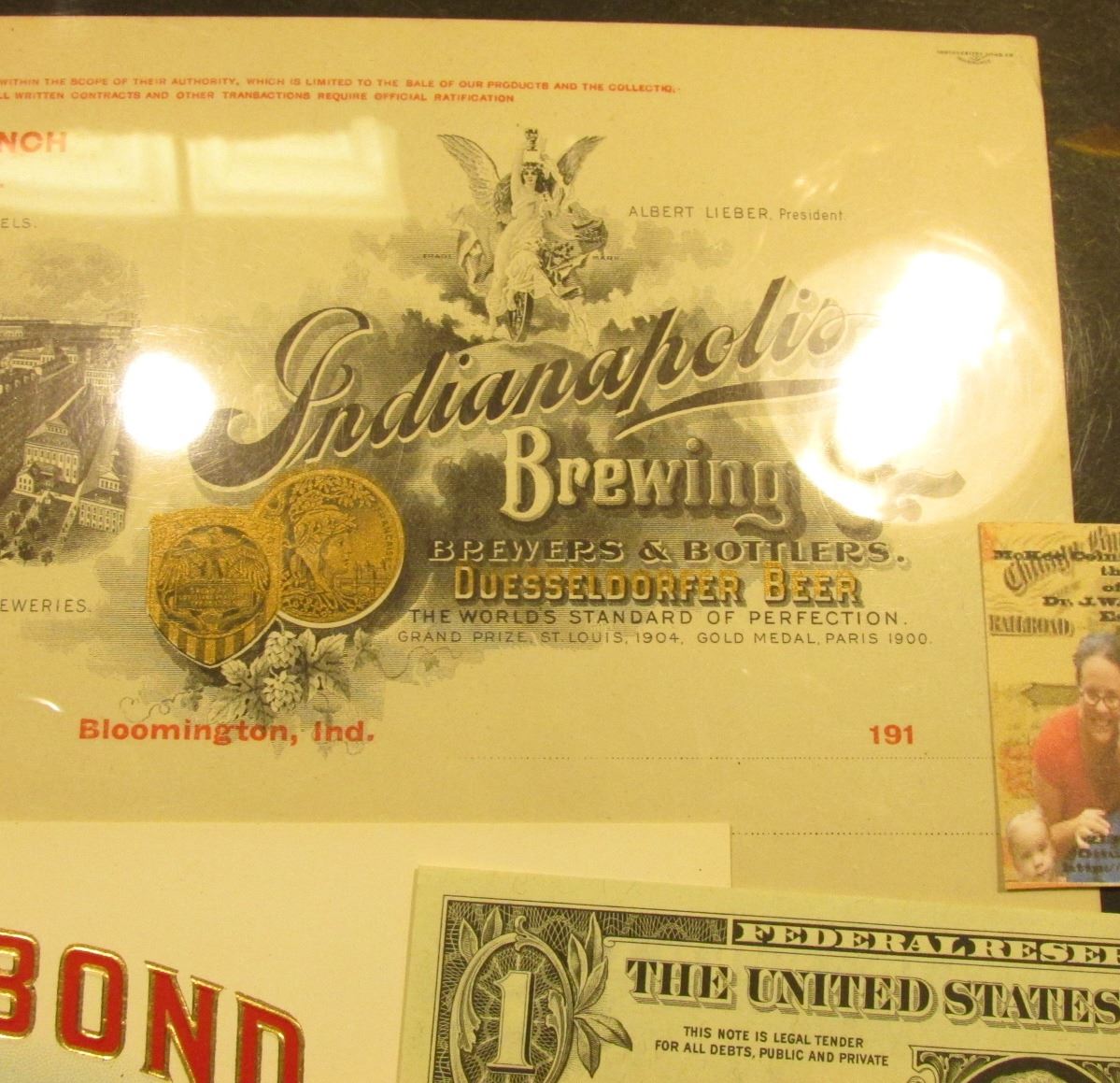 1910 era Letter head "Indianapolis Brewing Co. Brewers & Bottlers. Duesseldorfer Beer" Bloomington, Indiana; "Record Bond Value Received" Tobacco Box label, mint condition, depicting a man's hand with a bundle of currency; & (4) consecutive numbered Series 1963B "Joseph Barr" $1 Federal Reserve Notes.