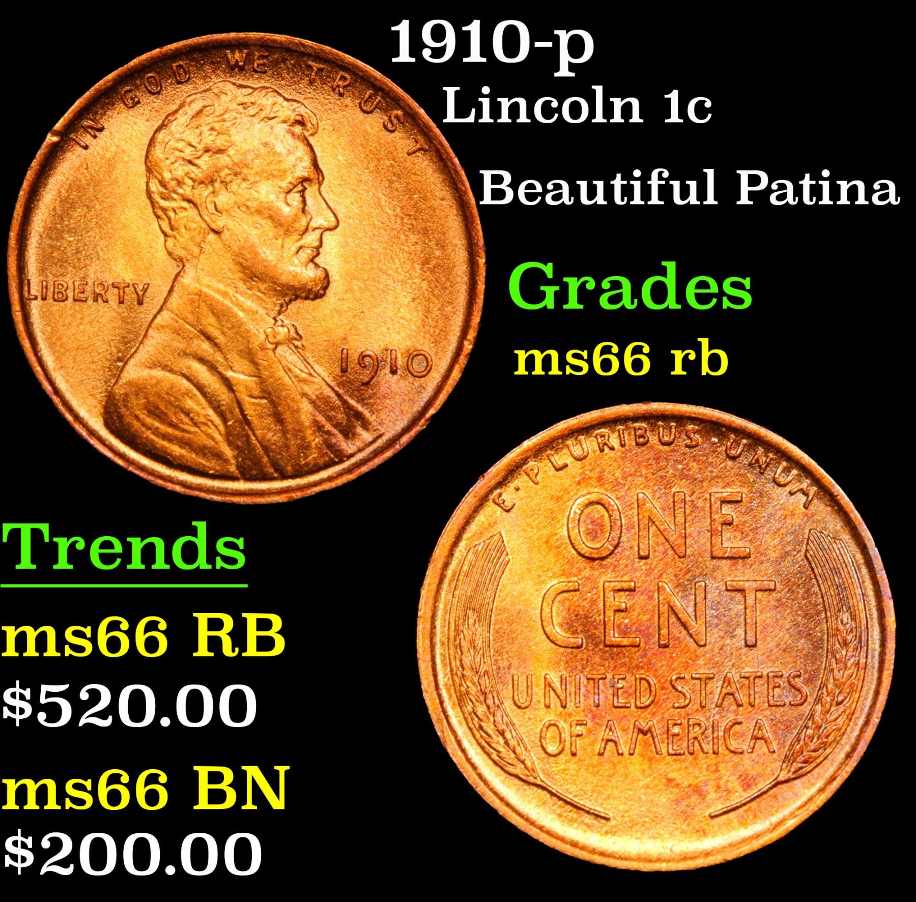 1910-p Beautiful Patina . Lincoln Cent 1c Grades GEM+ Unc RB. A Corey's Pick, Bid to Win, Don't let it get Away Coin