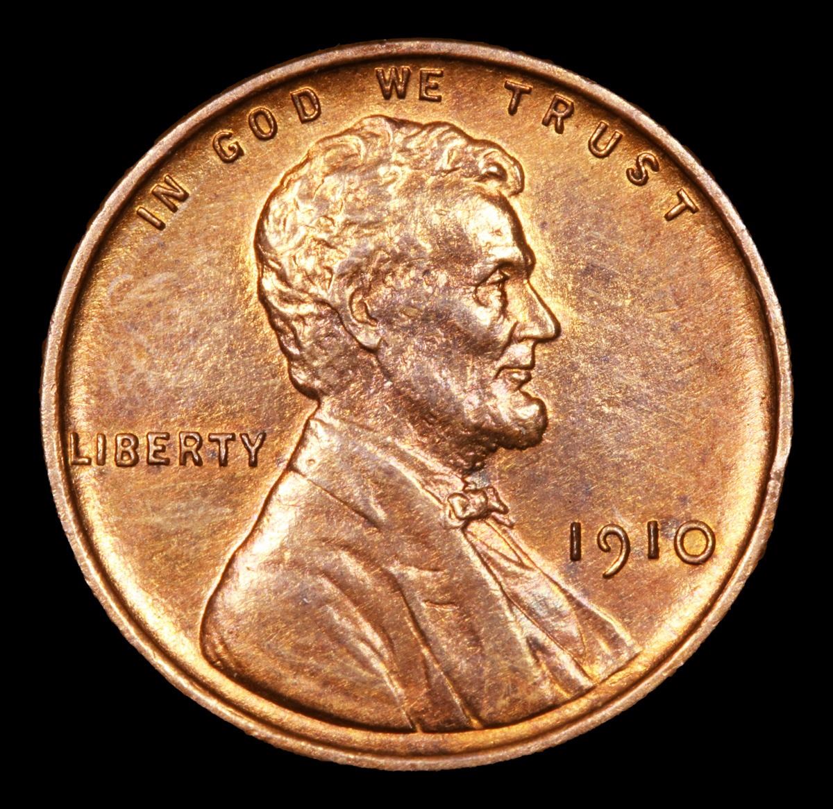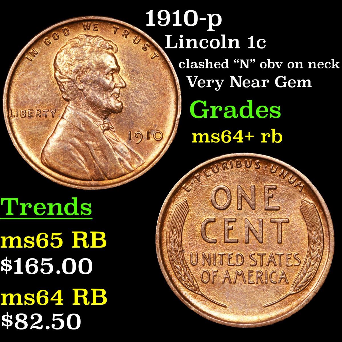 1910-p clashed "N" obv on neck Very Near Gem Lincoln Cent 1c Grades Choice+ Unc RB.