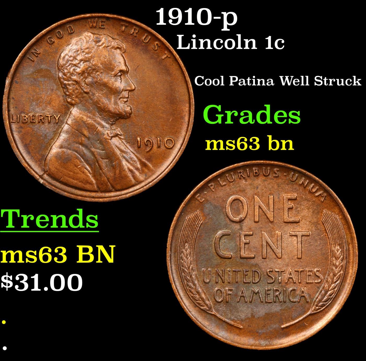 1910-p Lincoln Cent 1c Grades Select Unc BN.