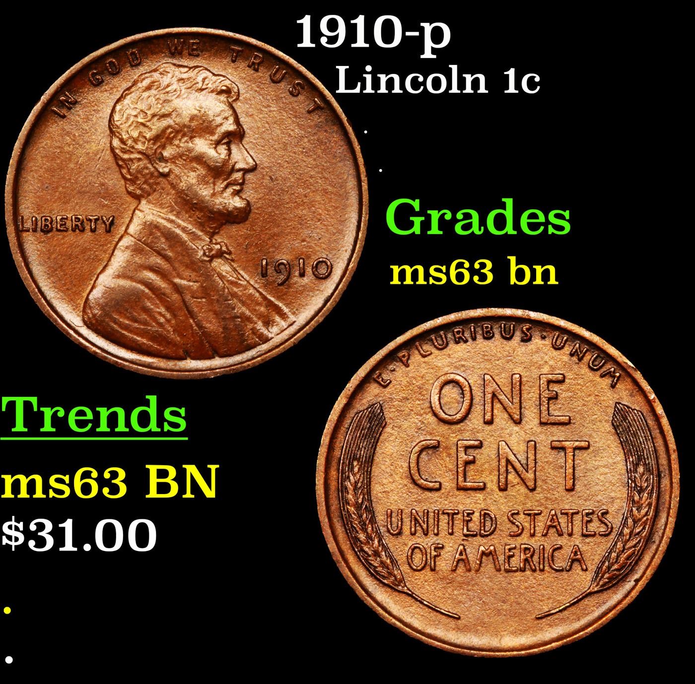 1910-p Lincoln Cent 1c Grades Select Unc BN.