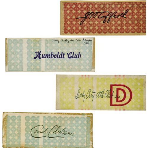 <B>1910's Boxing Tickets Lot Of 4.</B></I> Offered here is a fabulous group of early twentieth century full boxing tickets featuring several of the significant Champions and contenders of the time. First is the May 19, 1910 full unused ticket for the important middleweight match between Billy Papke and Joe Thomas in San Francisco won by Papke by sixteenth round knockout. The ticket is dated May 14th, but the fight was delayed five days. In excellent condition with no creases, clean front and back and only minor soiling. Second is the full ticket for Arthur Pelkey and Gunboat Smith for their fight of January 14, 1914, which was billed as a Heavyweight Championship (of white contenders). Smith won the fight. The ticket is in excellent condition with some minor glue stains on the reverse. It is dated days before the fight occurred (as it was delayed). Third is a full ticket for the December 27, 1912 fight between Gunboat Smith and Frank Moran in San Francisco won by Smith. The ticket is in excellent condition with no creasing and clean front and back. Last is a full ticket for the fight between Jimmy Clabby and Sailor Petroskey in San Francisco on October 3, 1913. It was billed as a Middleweight Title fight. Clabby won a twenty-round decision. This full ticket is in excellent condition with no creasing and some minor glue stains on the reverse. <I>LOA from Craig Hamilton / JO Sports.</B></I> <BR><BR><B>Important notice:</