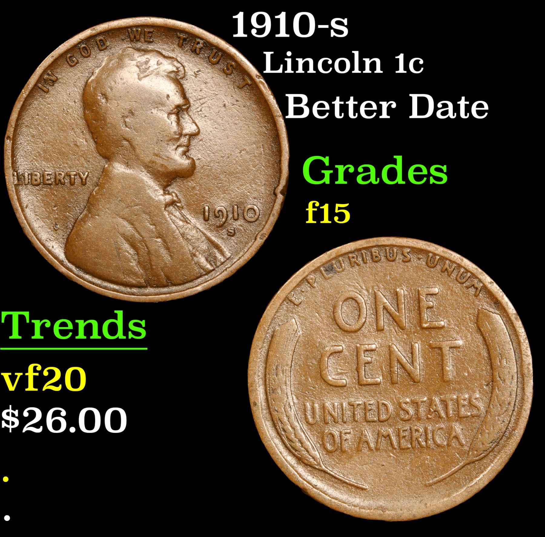 1910-s Lincoln Cent 1c Grades f+. Semi Key Date. Per David Hall of PCGS "The 1910-s has long been considered a semi-key date in circulated grades" Better Date