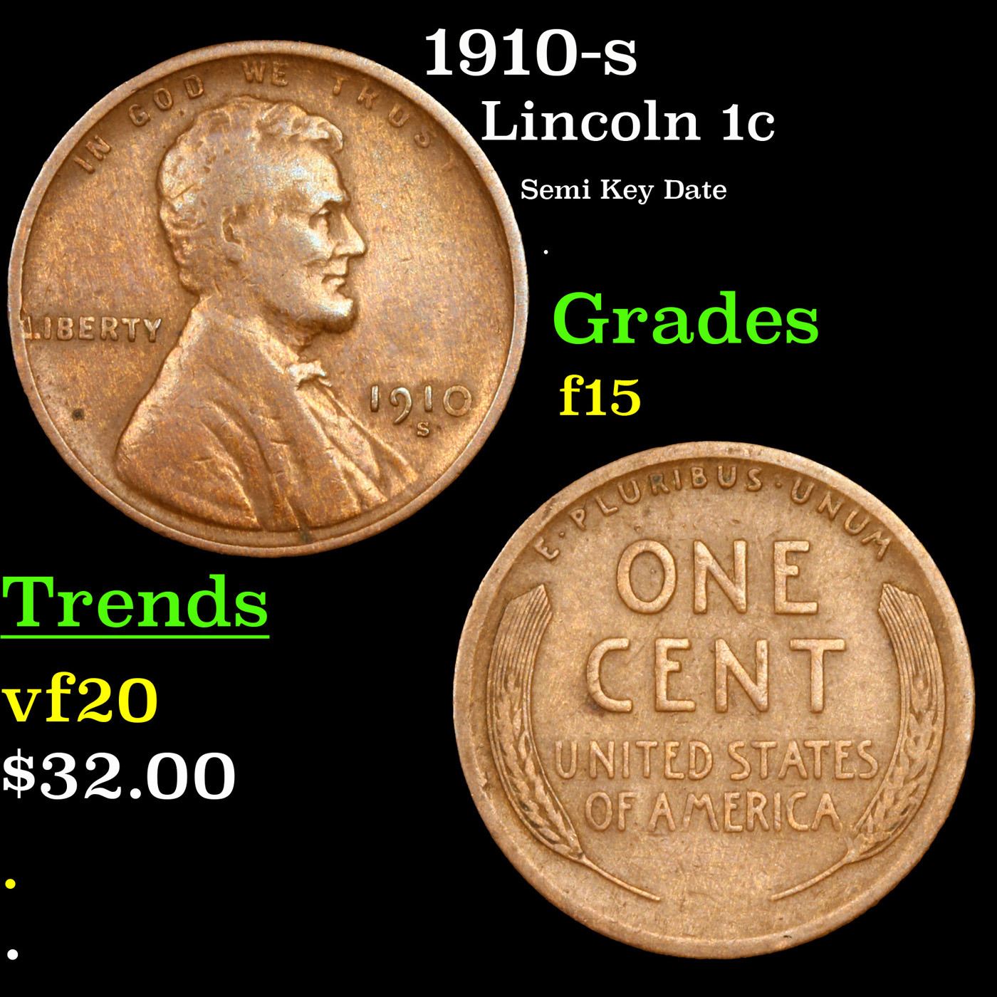 1910-s Lincoln Cent 1c Grades f+. Semi Key Date. Per David Hall of PCGS "The 1910-s has long been considered a semi-key date in circulated grades"