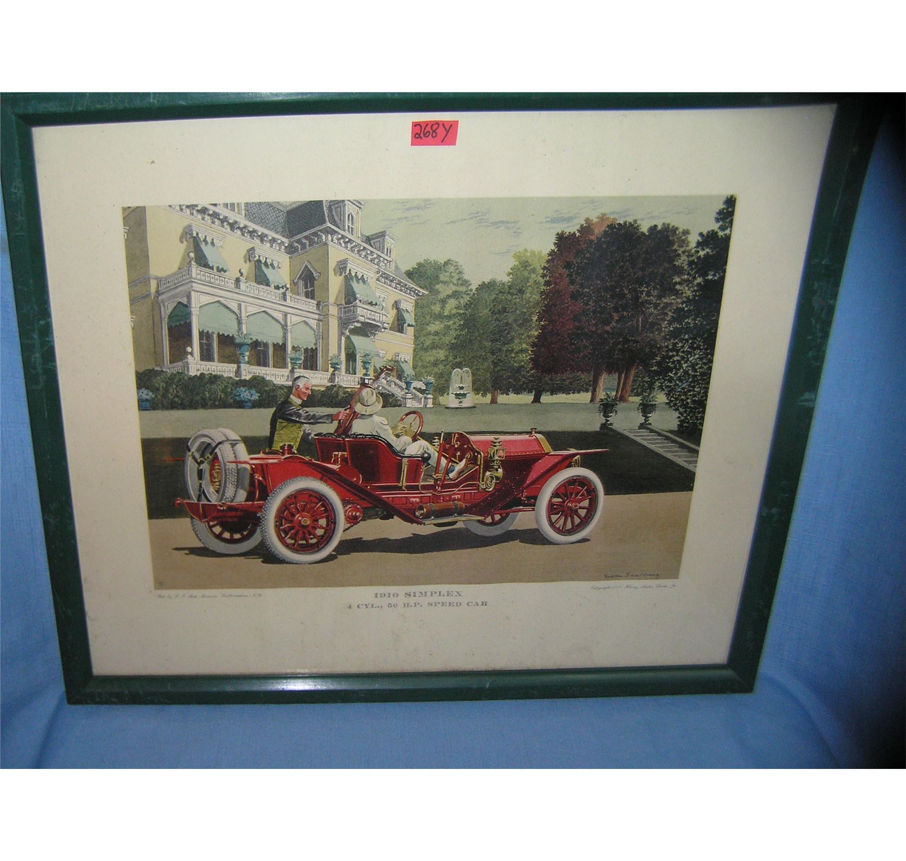 1910 simplex 4 cylinder 50 HP speed car vintage framed print dated 1952 est. value $100.00-$125.00
