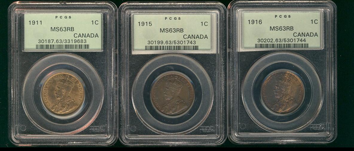 1911 1¢, 1915 & 1916 PCGS MS63RB. Lot of 3 coins.