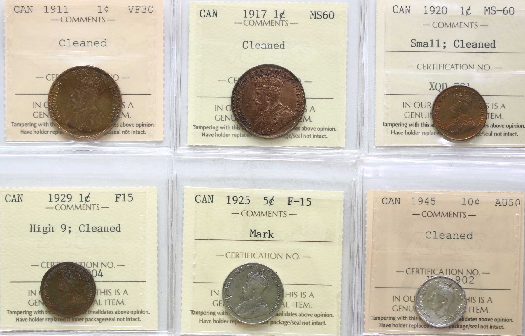 1911 1¢, 1917, 1920, 1929 "High 9", 1925 5¢, 1945 10¢ all 6 coins Choice Fine-15 to Mint State-60 with issues.