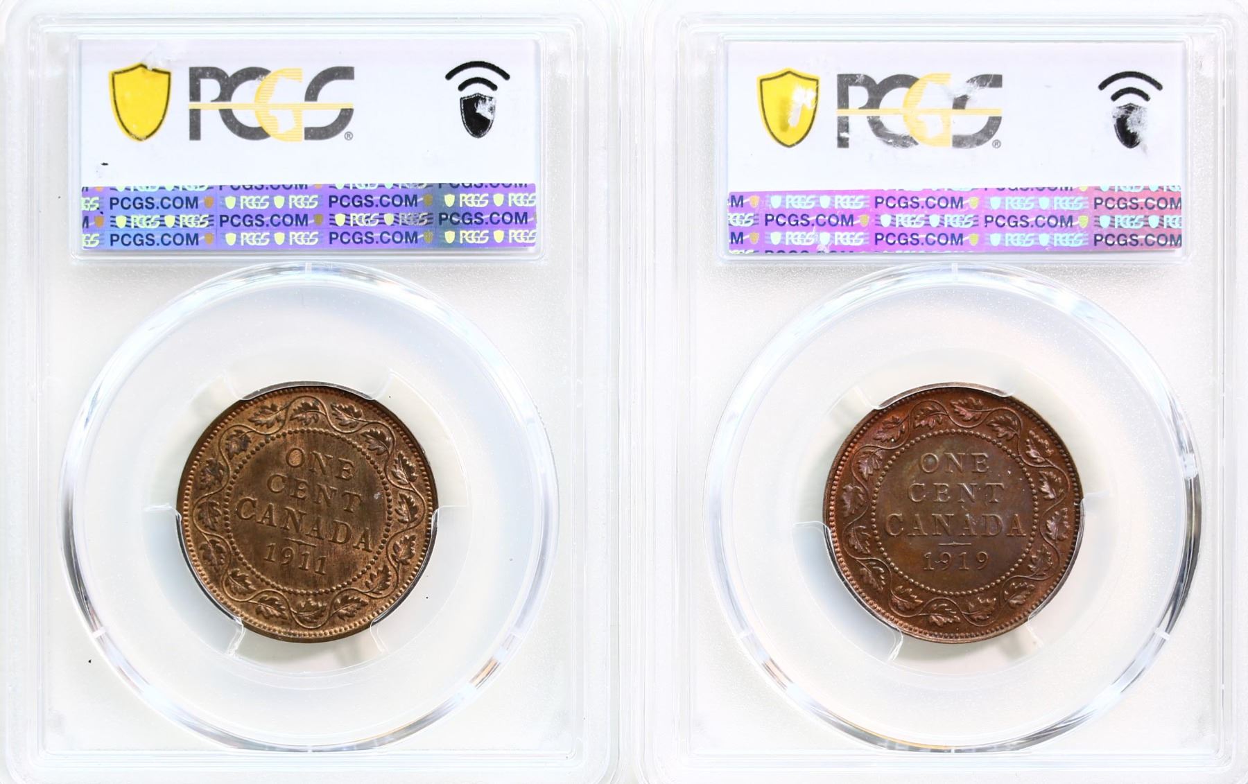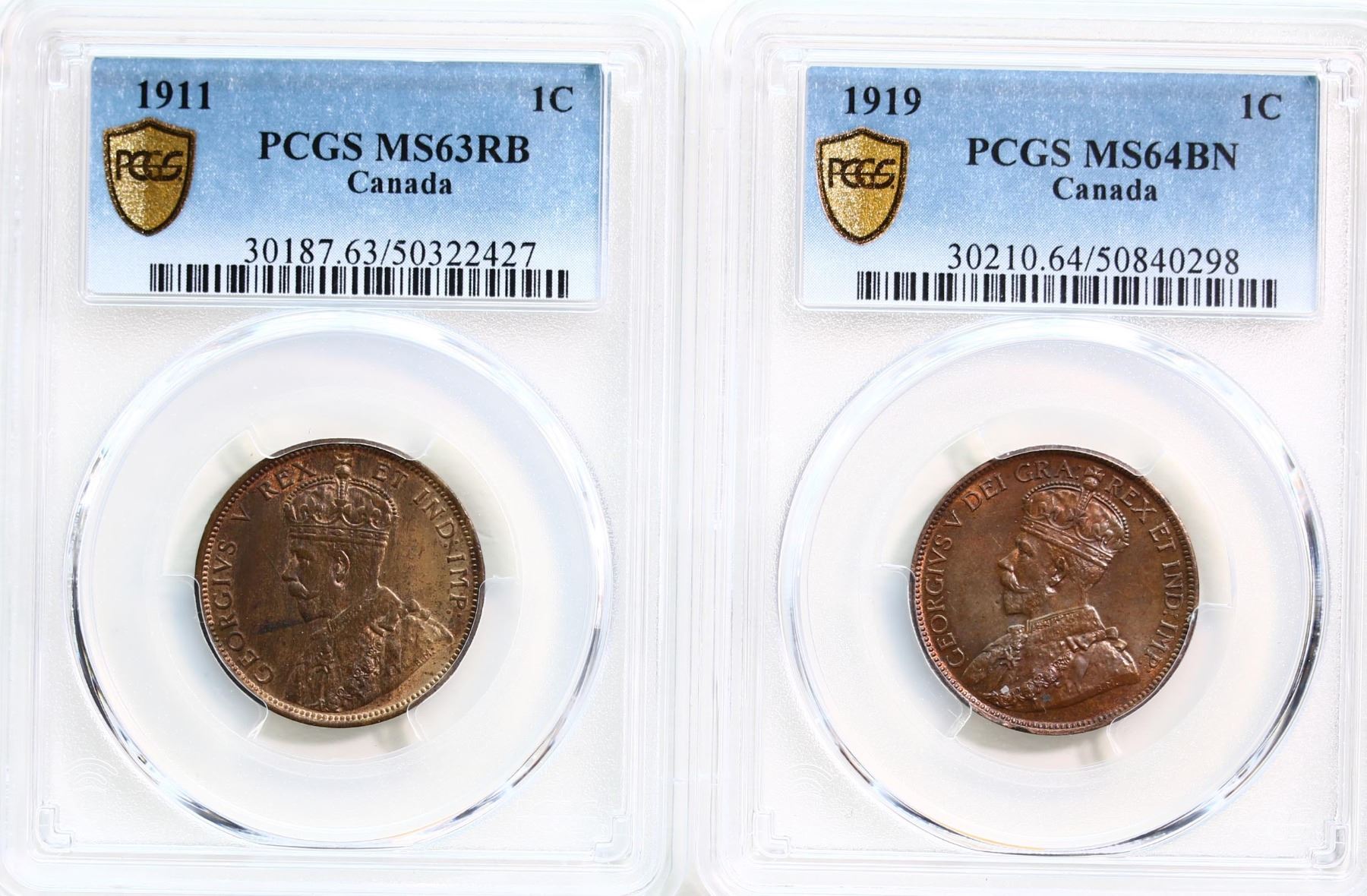 1911 1¢, 1919 Both coins PCGS graded Choice Mint State-63RB & Choice Mint State-64 BN respectively.