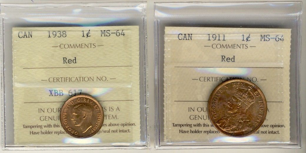1911 1¢ & 1938 ICCS MS64RD. Lot of 2 coins.