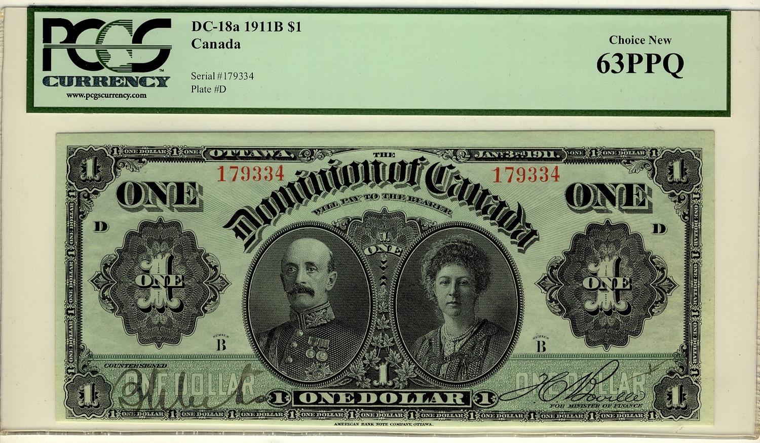 1911 $1 DC-18a #179334, PCGS CH UNC63PPQ. Green lines notes are rare in Choice uncirculated
