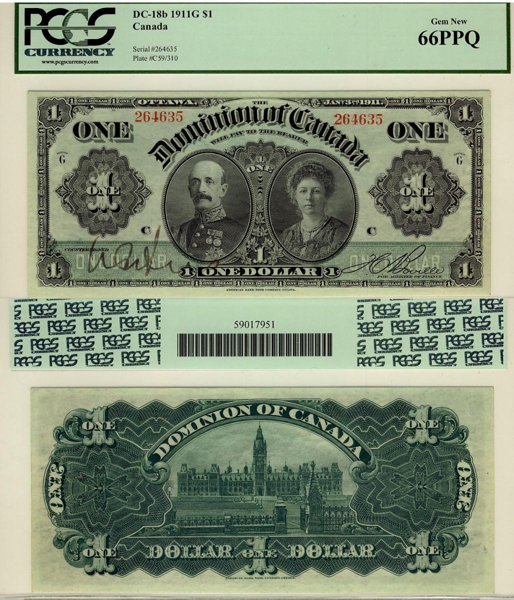 1911 $1 DC-18b #264635 PCGS Gem New 66 PPQ. The finest example by far. Best one seen by TCNC. Simply a splendid example, one of unforgettable quality and a highlight of this sale. Excessively scarce. Worth a premium bid.