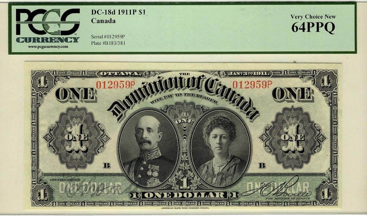 1911 $1 DC-18d /012959P, PCGS UNC64PPQ. Lovely example with great colours. Vibrant and crisp.