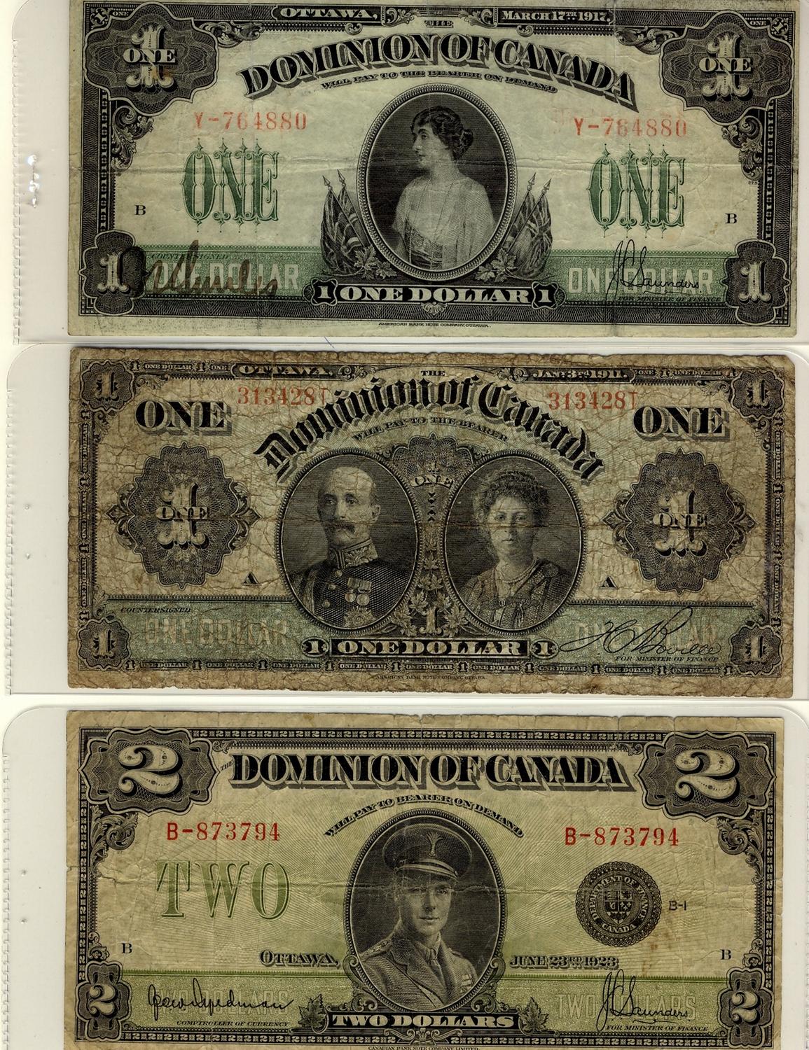 1911 $1 DC-18d, 1917 $1 DC-23b & 1923 $2 DC-26a. Lot of 3 Dominion issues G to Fine.