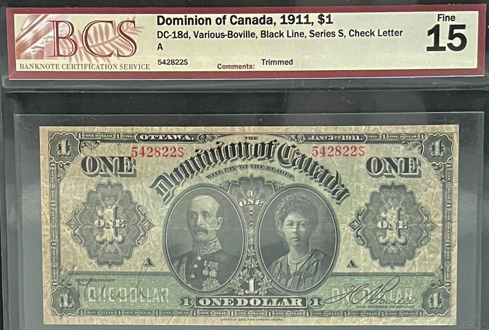 1911 $1 DC-18d #542822S BCS F15, trimmed. A bright example.