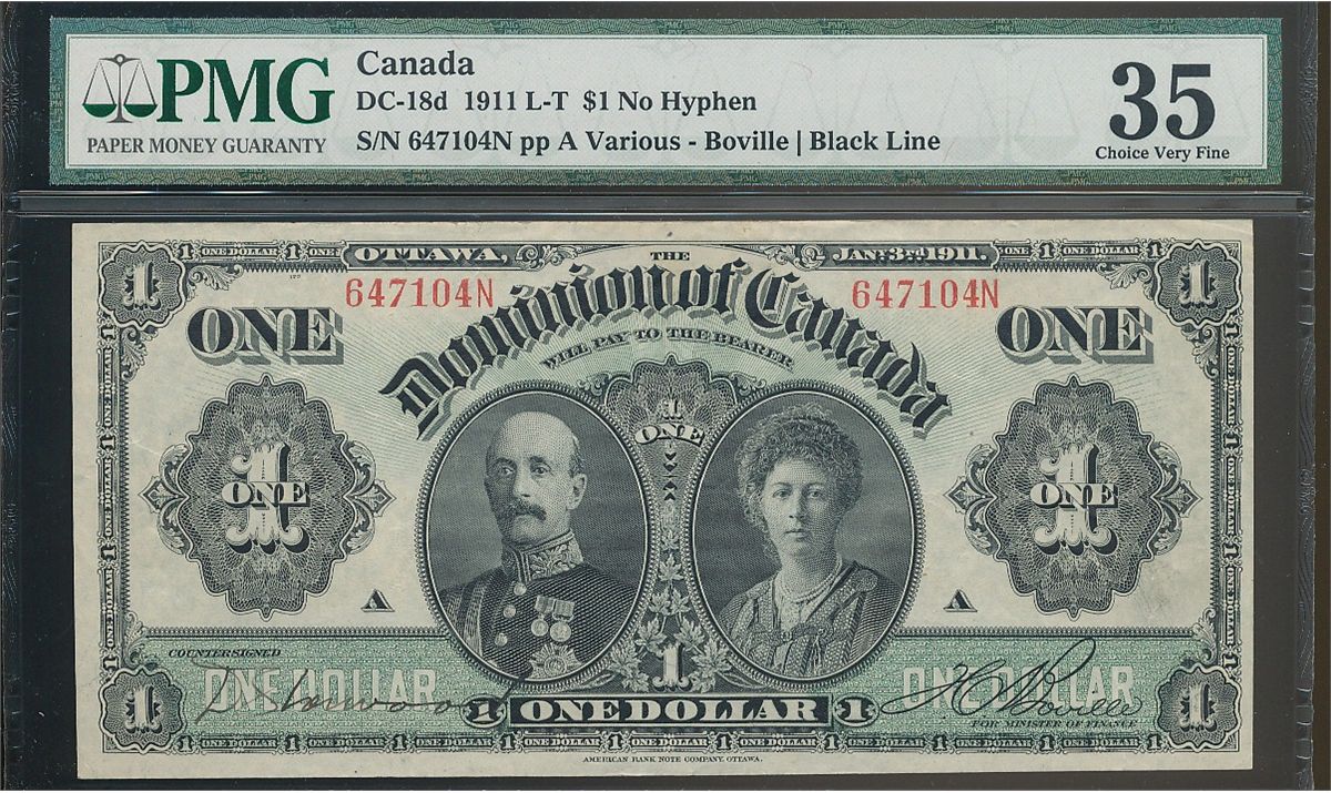 1911 $1 DC-18d #647104N, PMG CH VF35. Very nice and clean example.