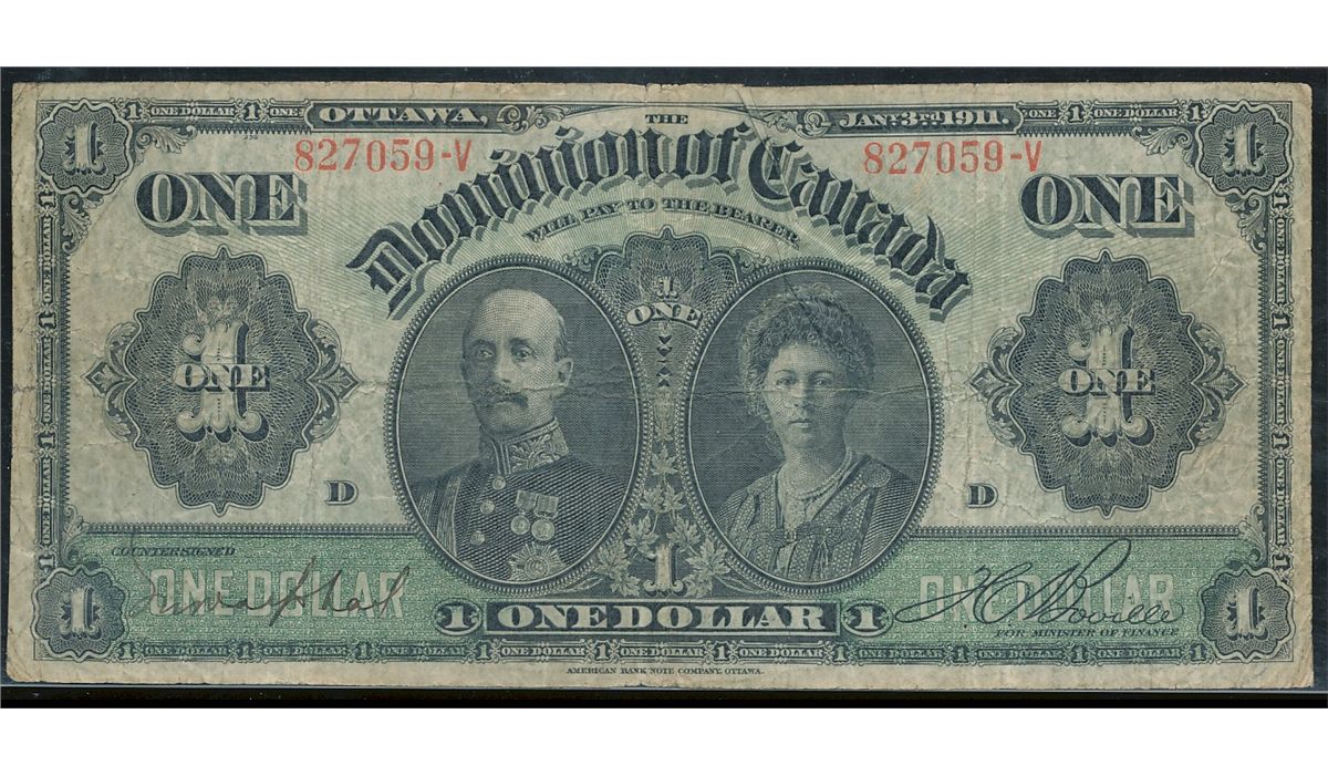 1911 $1 DC-18d-i #827059-V. F12 for grade with couple border splits.