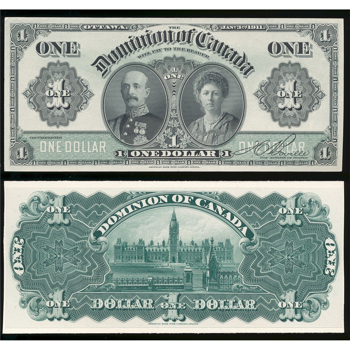 1911 $1 DC-18dFP & BP. Interesting Black line proofs on cardboard stock with green tint. Face proof issue shows bend in cardstock and note.