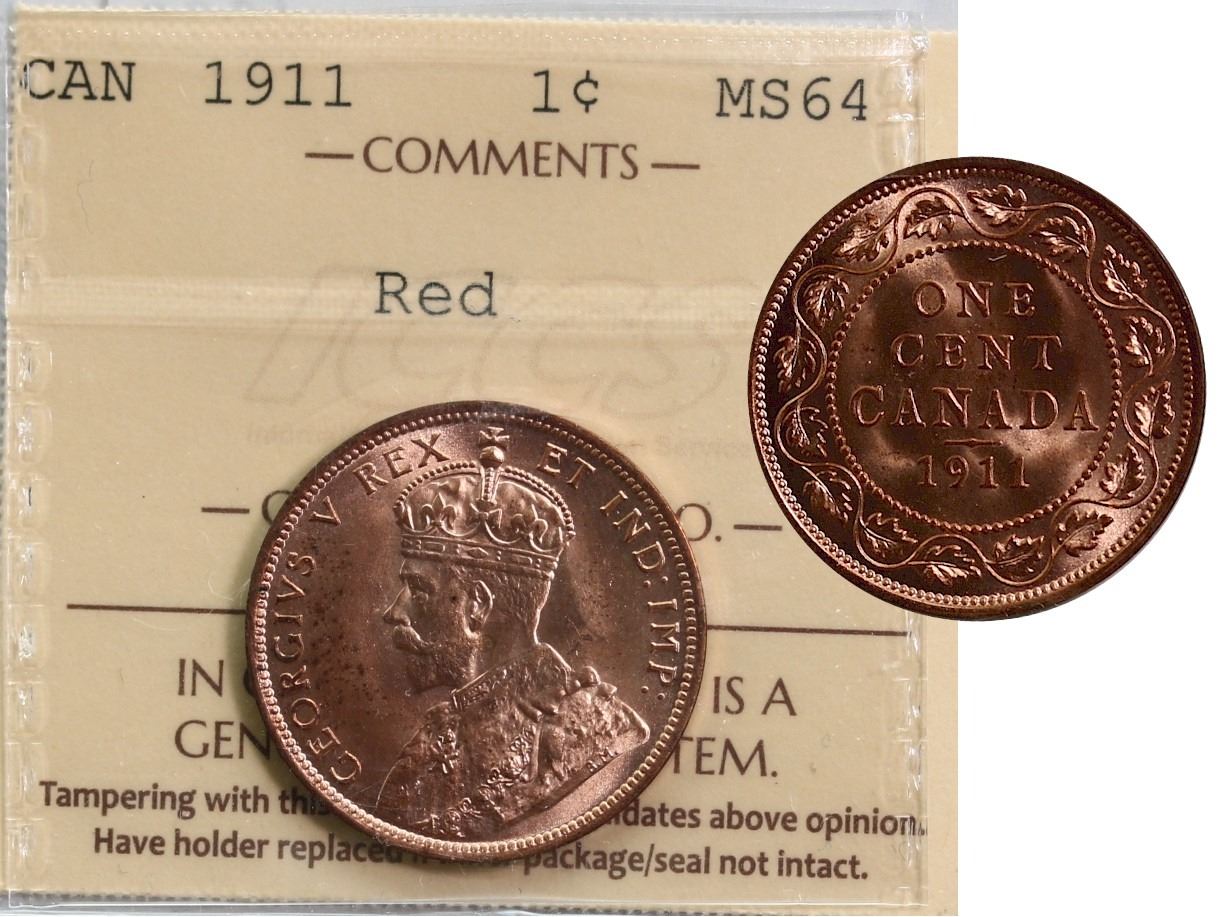 1911 1¢ ICCS Choice Mint State-64 90% Red lustre.