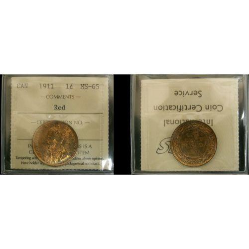 1911 1¢ ICCS MS65 Red sharp eye appeal with full lustre 95% red