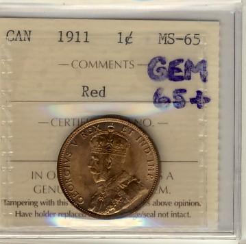 1911 1¢ ICCS MS65RD. 90% red with full lustre.