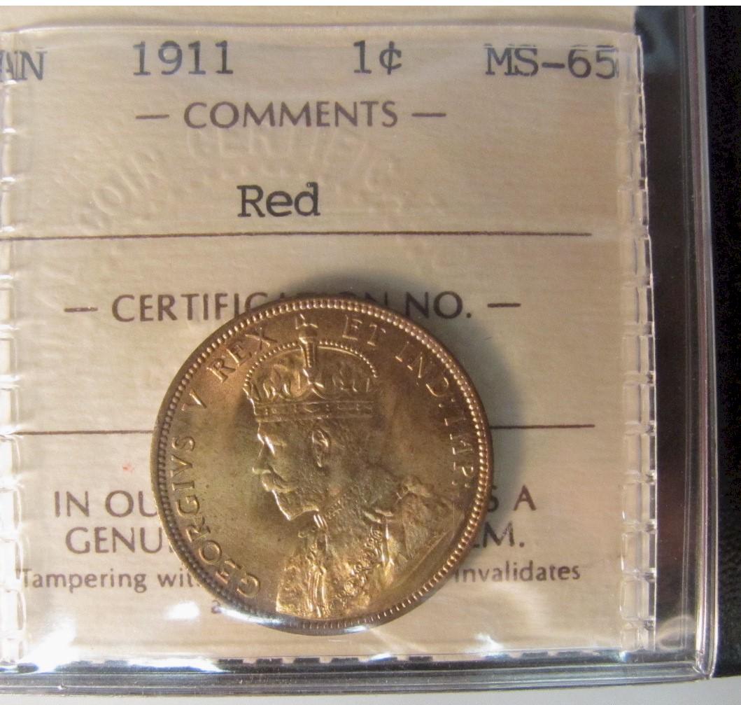 1911 1¢ ICCS MS65RD. 95% red with strong lustre.