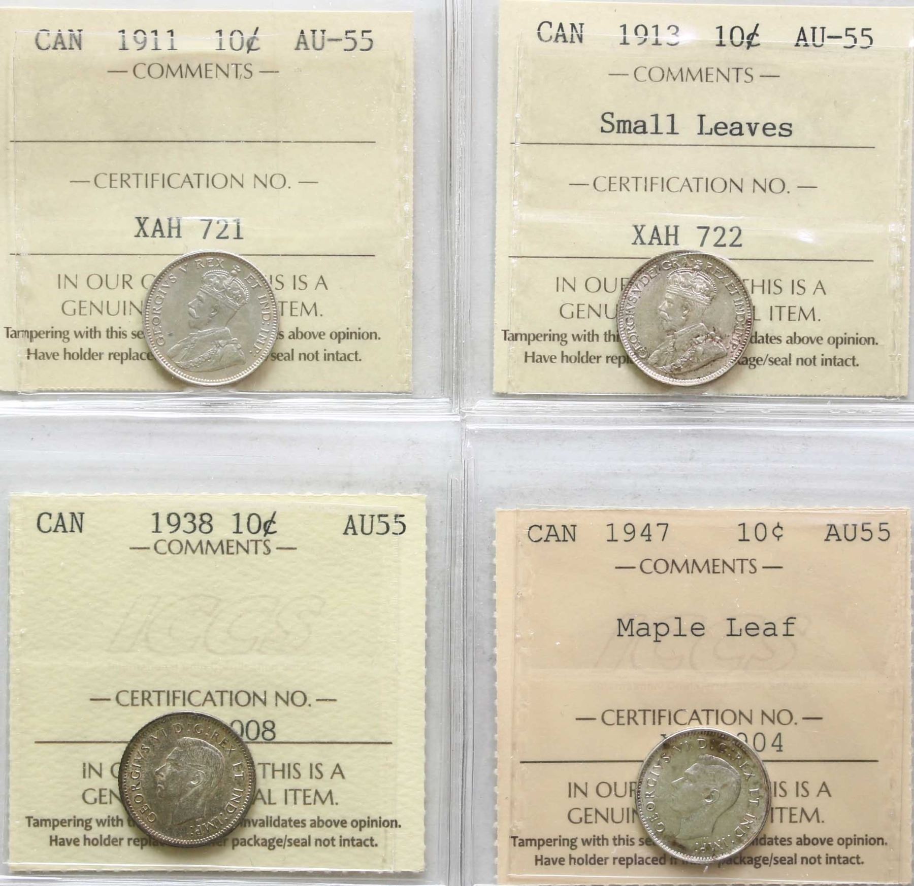 1911 10¢, 1913 "Small Leaves", 1938, 1947 "Maple Leaf", All 4 coins ICCS Choice About Uncirculated-5