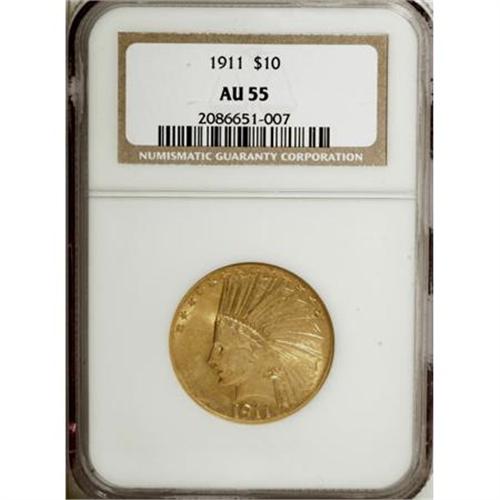 <B>1911 $10 AU55 NGC.</B></I> NGC Census: (55/5667). PCGS Population (214/4476). Mintage: 505,595. Numismedia Wsl. Price for NGC/PCGS coin in AU55: $525. (#8868)<BR><BR><B>Coin Engraver:</B> Augustus Saint-Gaudens<BR><BR><b>Shipping:</b> Coins & Currency (<a target="_blank" href="http://www.heritageauctions.com/common/shipping.php">view shipping information</a>)