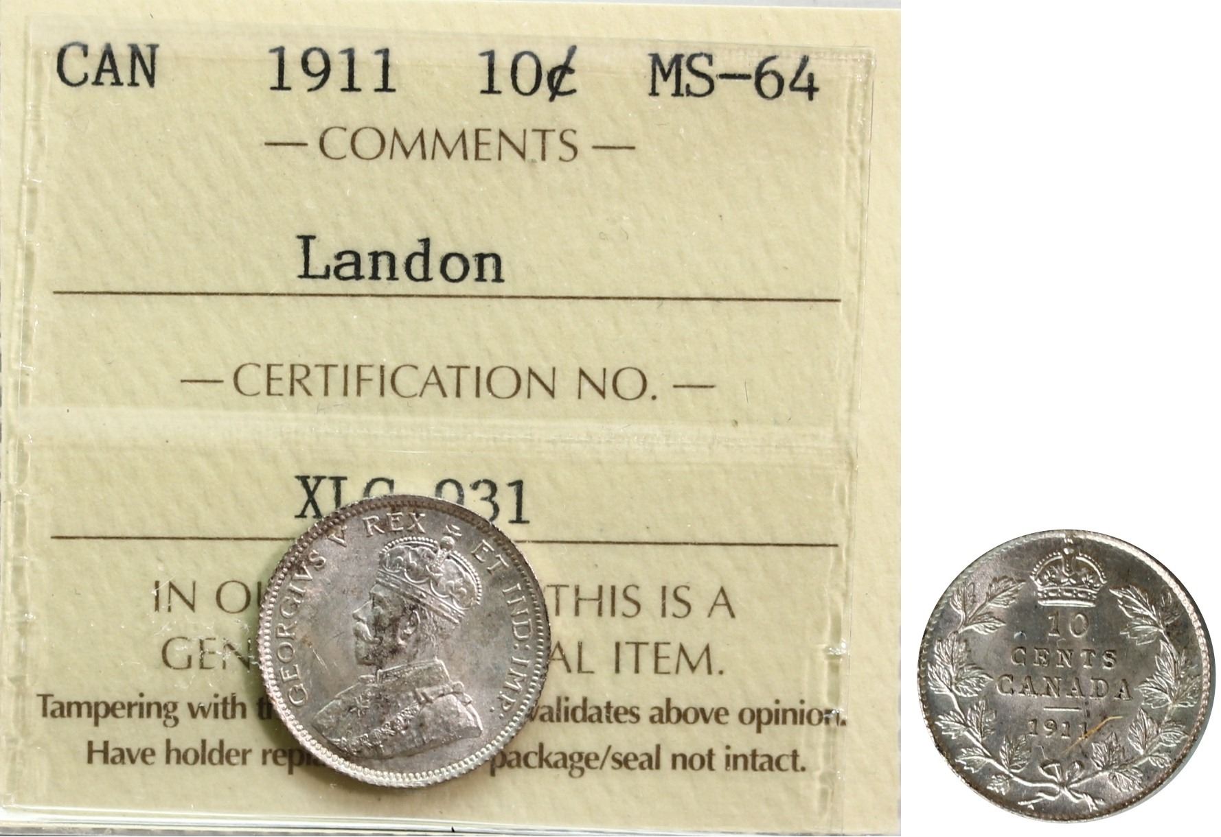 1911 10¢ ICCS Choice Mint State-64 Brilliant and lustrous with a hint of russet tone. Ex Landon example.