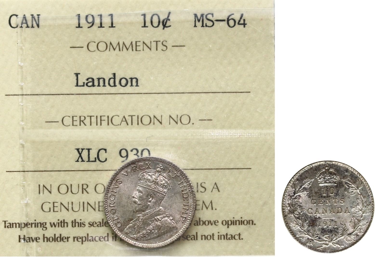 1911 10¢ ICCS Choice Mint State-64. Ex. Landon example.