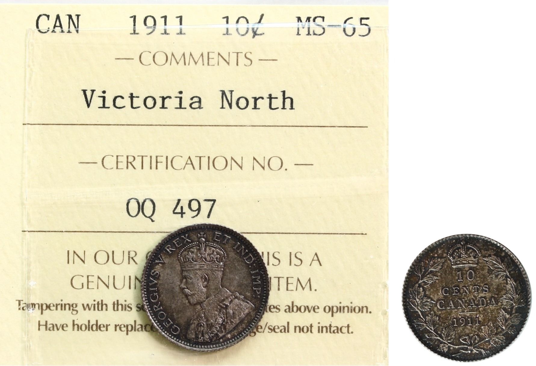 1911 10¢ ICCS Gem Mint State-65 great lustre with pink, russet and green tints. A lovely example. Ex. Victoria North example.