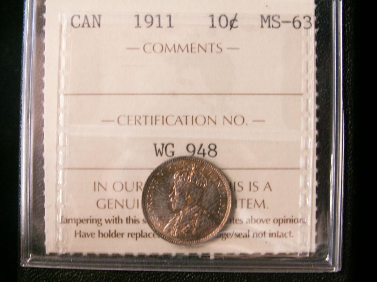 1911 10¢ ICCS MS63. Golden to brown tint.