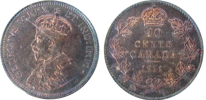 1911 10¢ ICCS MS64. Intense Bluish to red tones.