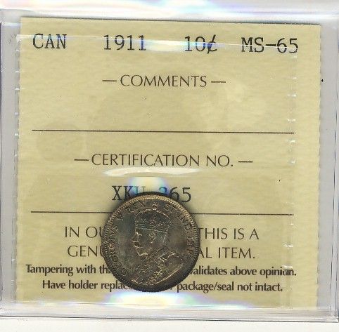 1911 10¢ ICCS MS65. Golden lustrous tone.