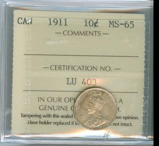 1911 10¢ ICCS MS65, a nice type coin. Lightly toned.