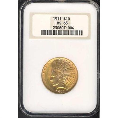 <b>1911 $10 Indian. NGC graded MS63.</b> Extra crisp detail on all relief portions. Swirling soft luster rounds out this coin's list of memorable attributes <b>(PCGS # 8868)</b> <i>