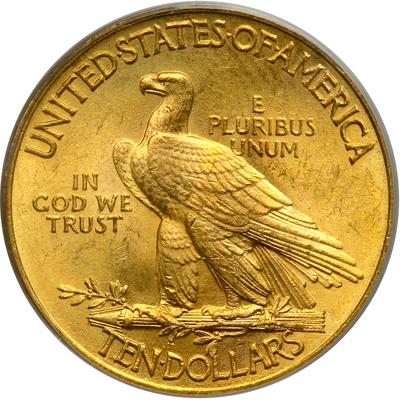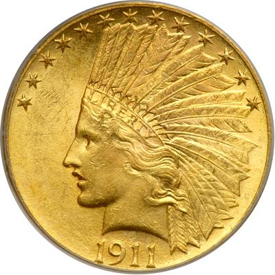 1911 $10 Indian. PCGS graded MS-63. Frosty with light even toning. Both sides display a frosty sheen and satiny brilliance, being predominately yellow-gold with a touch of reddish color (PCGS # 8868).