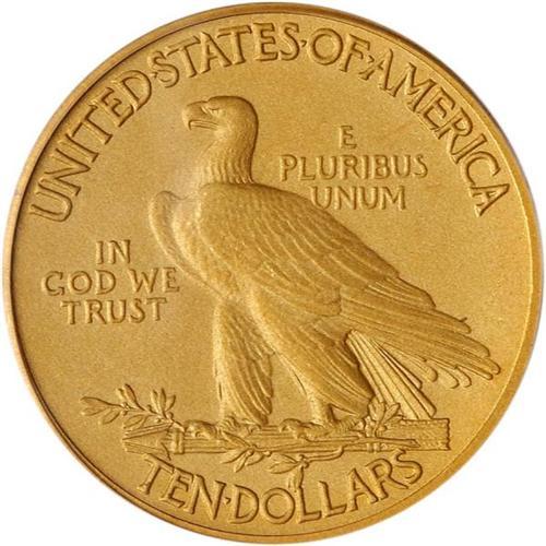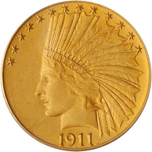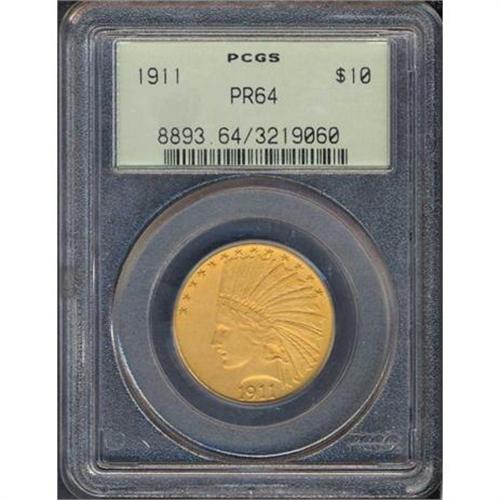 <b>1911 $10 Indian. PCGS graded Proof 64.</b> Dark fine sandblast finish Proof, darker than the satin 1908 issues, more like the dark 1908's more often seen; researchers call this mustard color. Only 95 made. About as rare as the 1910; we believe 30 or 40 survive. The grading statistics are of no help due to constant resubmissions by hopeful owners which skews the number.