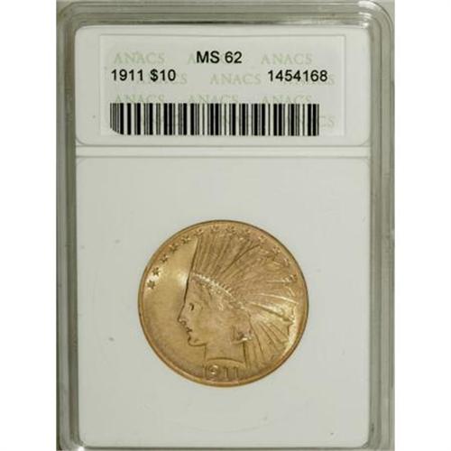 <B>1911 $10 MS62 ANACS.</B></I> NGC Census: (1858/1631). PCGS Population (1524/1380). Mintage: 505,595. Numismedia Wsl. Price for NGC/PCGS coin in MS62: $1,050. (#8868)<BR><BR><B>Coin Engraver:</B> Augustus Saint-Gaudens<BR><BR><b>Shipping:</b> Coins & Currency (<a target="_blank" href="http://www.heritageauctions.com/common/shipping.php">view shipping information</a>\)