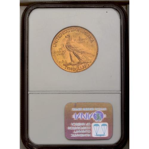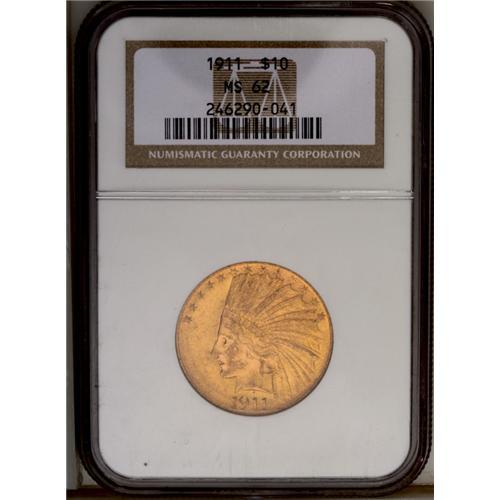<B>1911<$10> MS62 NGC.</B></I> Frosty and lustrous with moderately abraded surfaces. Brilliant yellow-gold with hints of pink overtones, and splashes of olive-brown toning on the headdress, portrait, and elsewhere.