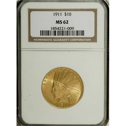 <B>1911 $10 MS62 NGC.</B></I> NGC Census: (1834/1617). PCGS Population (1524/1365). Mintage: 505,595. Numismedia Wsl. Price for NGC/PCGS coin in MS62: $1,050. (#8868)<BR><BR><b>Shipping:</b> Coins & Currency (<a target="_blank" href="http://www.heritageauctions.com/common/shipping.php">view shipping information</a>)
