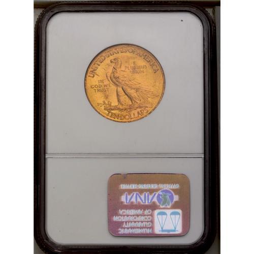 <B>1911<$10> MS62 NGC.</B></I> Tinges of green grace the protected areas, while copper-gold predominates elsewhere. A lustrous and attractive piece, although a couple of notable abrasions in the reverse left field limit a higher grade.